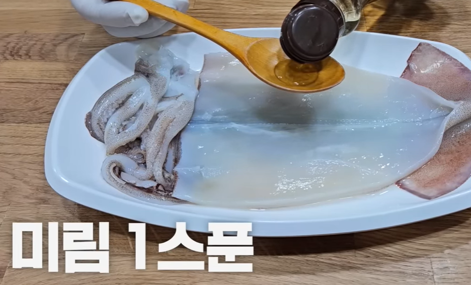 오징어 1마리를 깨끗하게 손질하고 미림 1스푼을 둘러줍니다.