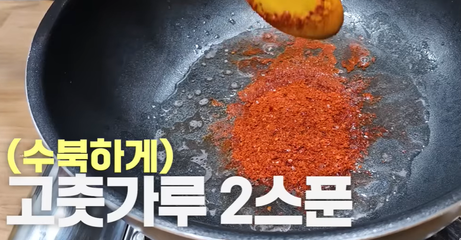 가스불을 끈 상태에서 고춧가루 수북하게 2스푼을 넣어줍니다.