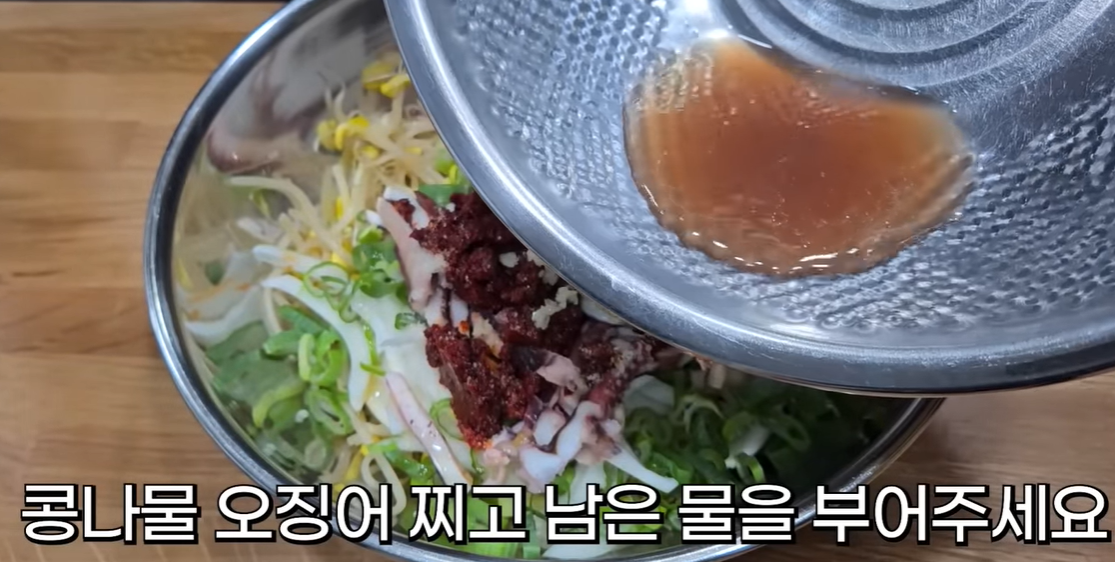 콩나물 오징어 찌고 남은 물은 반드시 넣어줘야 감칠맛이 돌아 맛있습니다.