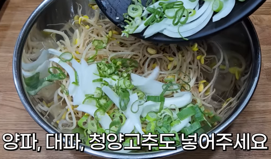 콩나물 식힌 것, 양파, 대파, 청양고추, 오징어를 볼에 넣어줍니다.