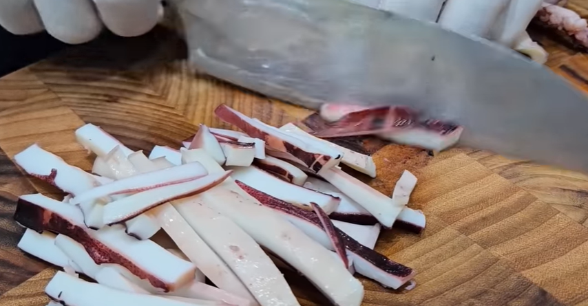 오징어를 먹기 좋게 잘게 썰어 줍니다.