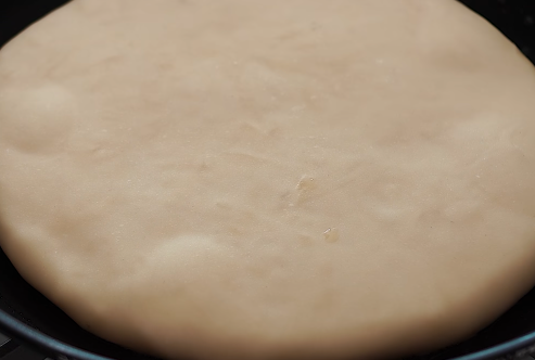 7. 한시간 후 발효가 끝난 반죽을 꺼내어 밀대로 동그랗게 펴줍니다.