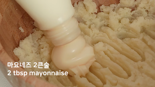 6. 찐 감자 한개를 으깬 뒤 마요네즈 2큰술을 섞어주세요.