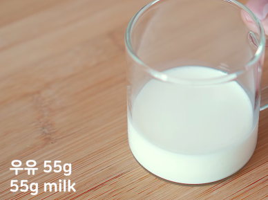 1. 강력분 90g, 우유 55ml와 무염버터 10g을 녹여서 준비합니다.