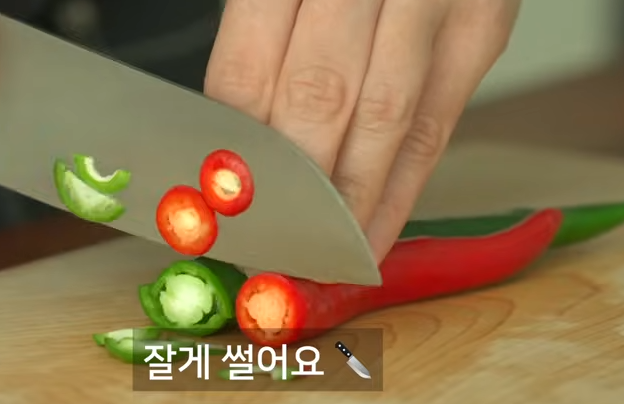 두꺼운 고추는 반으로 가르고 잘게 썰어요.