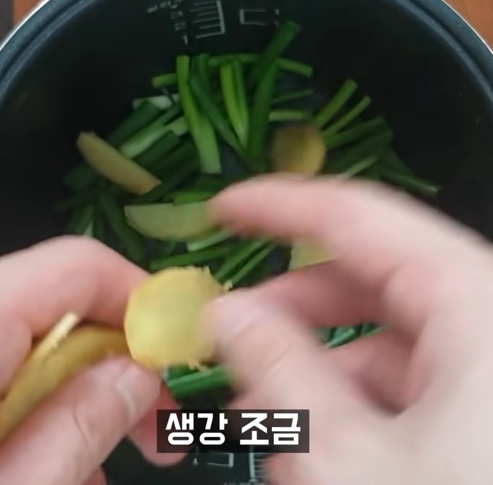 조리 전 밭솥에 쪽파나 대파를 깔고, 생강을 넣은 후 돼지고기를 얹어주세요.