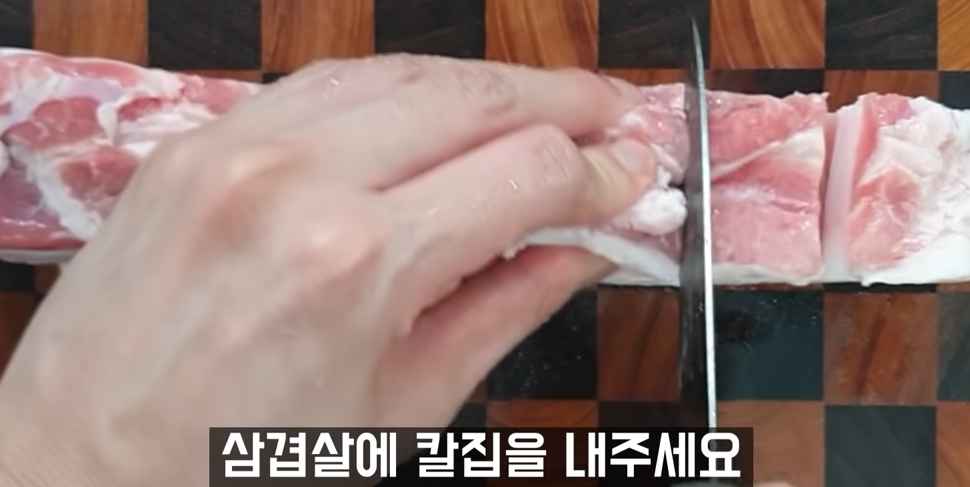 양념에 맛을 더하기 위해 삼겹살에 칼집을 내주세요.