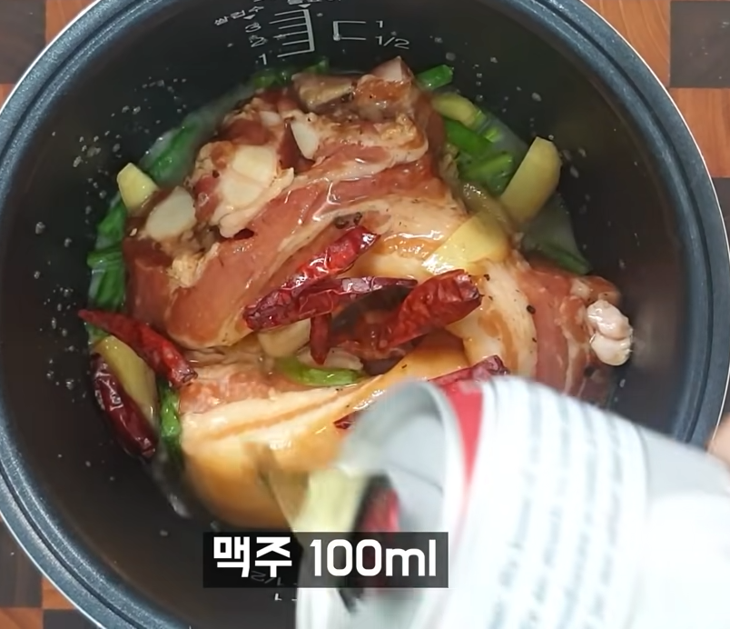 건고추와 맥주 100ML 추가하면 돼지고기가 부드럽게 익고 잡내가 없어지는데 도움을 줄 것입니다.