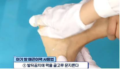 1. 발뒤꿈치에 팩을 골고루 문질러줍니다.