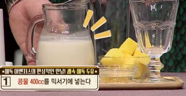 쾌속 해독 두유 재료 : 콩물, 파인애플, 발효 식초, 어성초 가루