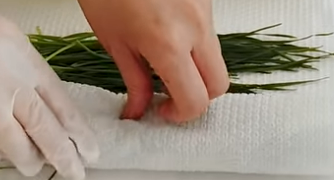 부추 끝 부분을 1cm 정도 잘라준 뒤 끝부분만 물에 담가 습기를 흡수하게 합니다.