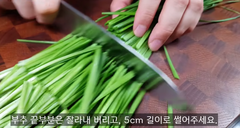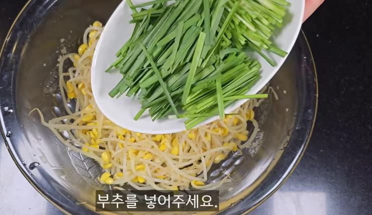 콩나물은 깨끗하게 씻어 물기를 빼주시고 부추는 끝부분을 버린 뒤 5cm정도 길이로 썰어줍니다.
