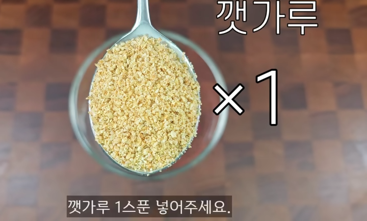 고춧가루 한 스푼, 소금 작은스푼 반 정도, 소고기 다시다 1작은 스푼, 통깨를 갈아 깻가루 한 스푼을 잘 섞어서 가루 양념을 완성시켜주세요.