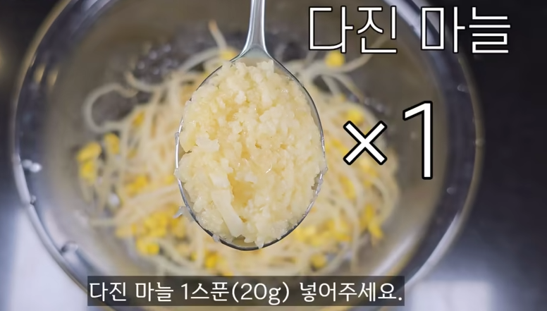 4. 뜨거운 콩나물에 다진 마늘 한 스푼을 넣고 섞어줍니다.