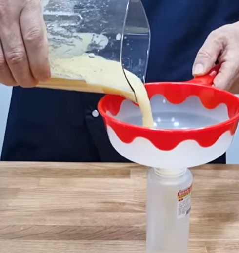 믹서기에서 간 소스를 소스통에 부어줍니다.