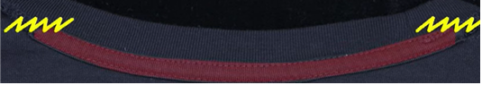 두 번째는 넥 부분과 몸판을 바늘 세 개로 봉제하는 공법인 트랙스티치가 있는데 이 부분이 되어 있는지 확인하시면 됩니다.