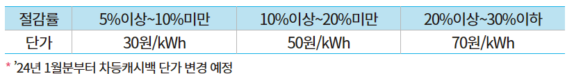 차등캐시백 : 평균절감률과 상관없이 절감률 5% 이상 달성 시 30%한도로 하여 절감률 구간별로 절감량(1kWh) x 30~70원 차등 지급