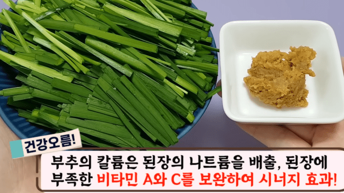또한 부추에 풍부한 칼륨 성분은 된장의 나트륨 배추를 돕고 된장에 부족한 비타민 A와 C를 보완하여 시너지 효과가 우수합니다.