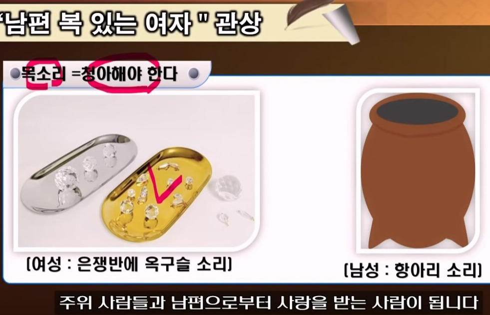 여성의 목소리는 은챙반에 옥구슬 소리처럼 청아하고 부드러운 것이 좋습니다.