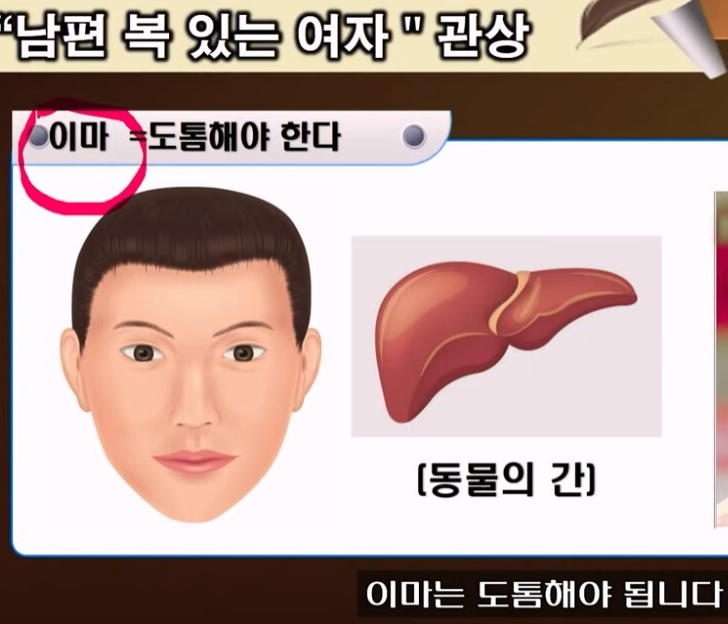 이마가 동물의 간처럼 도톰하면 남편도 잘 만나고 남편의 하는 일도 잘 풀립니다.