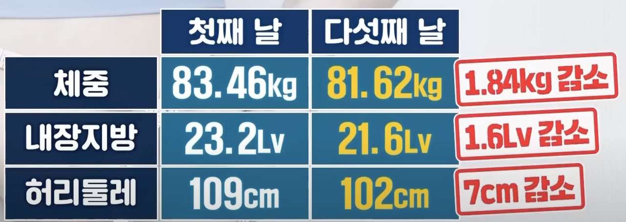 실제로 해당 방법대로 실험해본 사람은 5일만에 체중이 2kg가량 빠지고 내장지방과 허리둘레까지 감소했습니다