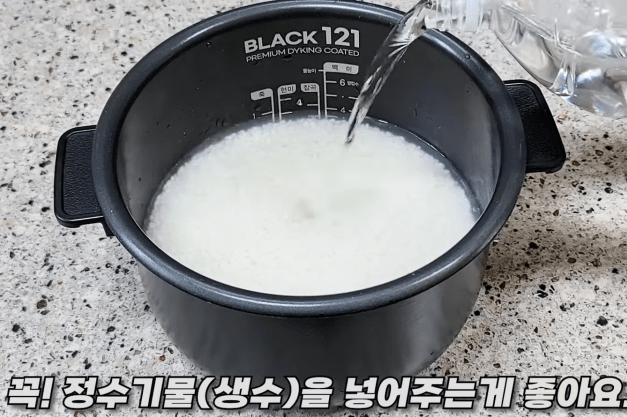 쌀이 마른 상태라 물을 많이 흡수하기 때문에 첫 물은 정수기 물을 넣어주는 게 좋아요.
