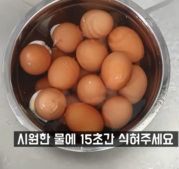 그 후 다시 한번 찬물을 부어 금이 간 계란 속에 물이 들어가게 하고 그대로 계란을 까줍니다.