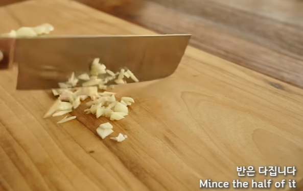 마늘 5쪽 중 반은 다지고 반은 편썰어줍니다.
