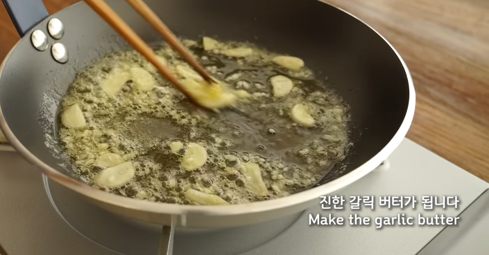 불을 켜기 전, 팬에 올리브 오일 2큰술 버터 2큰술 마늘 까지 다 넣고 약불을 켭니다