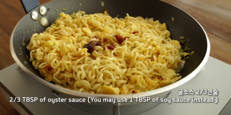라면 사리 1개 2. 계란 2-3개 3. 마늘 4. 페페론치노 (없으시면 고춧가루 1티스푼 넣으세요) 5. 쪽파 6. 버터. 올리브유. 식용유 7. 굴소스 8. 소금, 후추