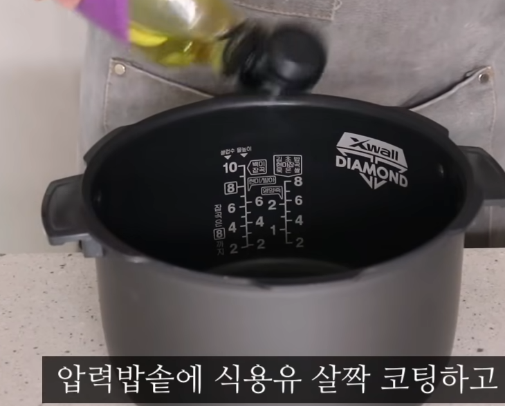 압력밥솥에 식용유로 살짝 코팅하고 반죽을 넣어줍니다.