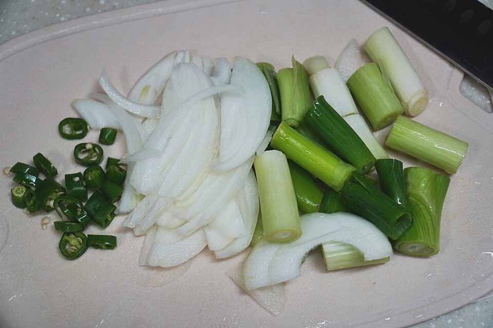그리고 대파 양파 청양고추 어묵까지 이렇게 썰어 놓았는데요 어묵은 뜨거운물에 한번만 헹굼을 해주세요 분량의 양념장 만들어주세요