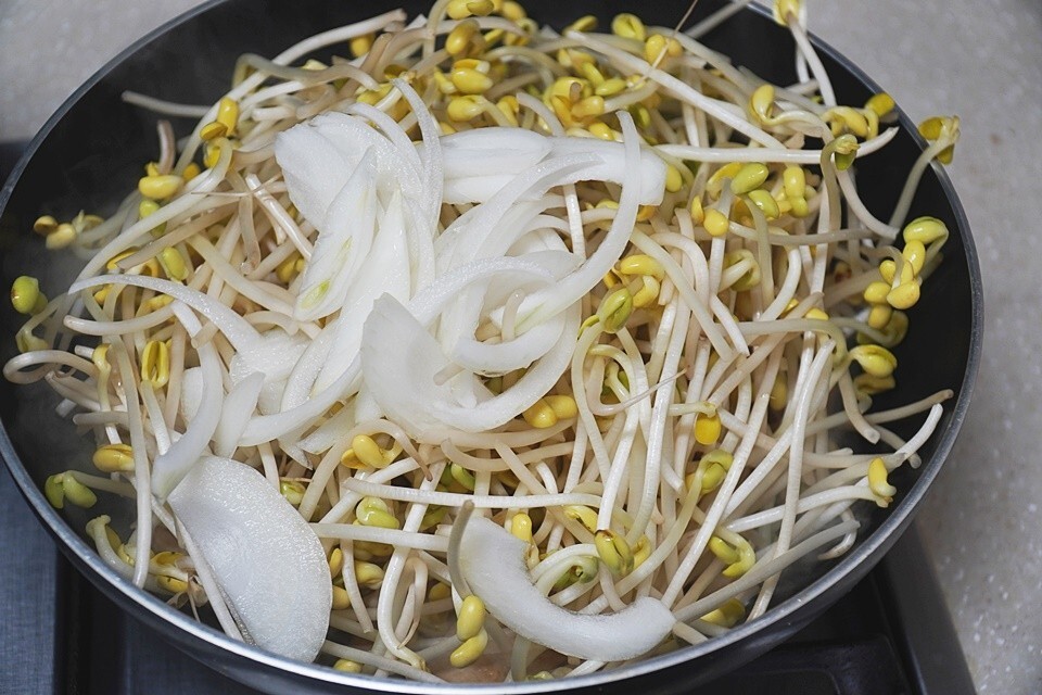 저는 떡국떡이 없어서 못넣었어요 그리고 물이 끓어오르면 콩나물과 양파를 넣어주세요