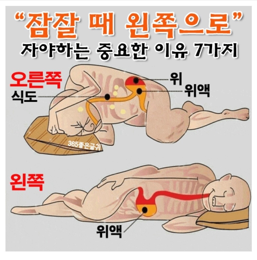 왼쪽으로 누우면 위산이 식도로 역류되는 현상을 방지해 속쓰림 완화와 소화 불량 개선에 도움이 된다.