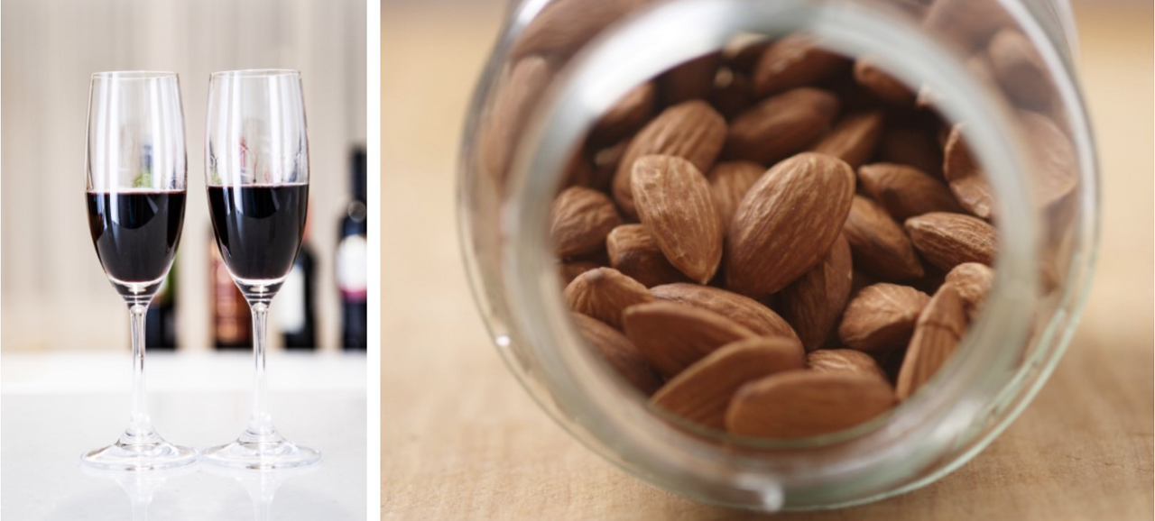 레드와인은 콜레스테롤 수치를 낮추고 심장을 보호해 주는데 아몬드와 함께 먹으면 레드 와인에 있는 항산화제인 레스베라트롤과 비타민E가 작용을 해서 혈관 건강을 향상시켜 줍니다.