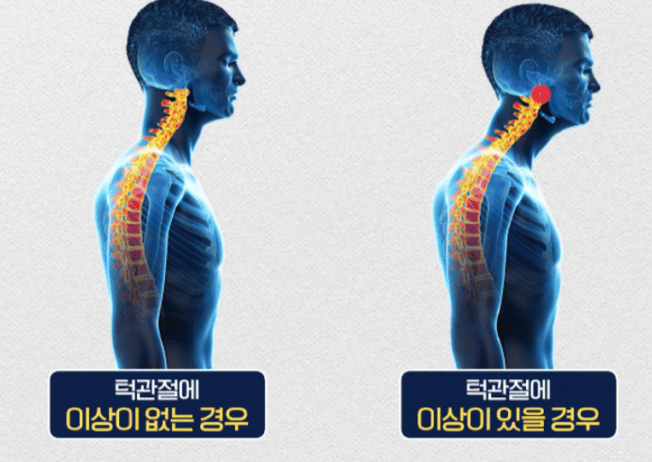 턱관절에 문제가 있으면 척추의 균형이 무너지면서 대표적으로 거북목이 된다고 하는데, 목의 아랫부분과 경추 1~2번이 모두 굽은 상태로 턱관절 이상시 굽은 목이 혈액순환을 방해한다고 합니다.