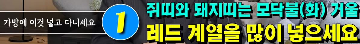 쥐띠랑 돼지띠는 모닥불 그림이 그려진 거울을 하나 구매하셔서 가방에 계속 놓고 다니시면 운의 상생이 좋다 할 수 있고 거울을 구매하시 이이 안 되시거나 이미 거울 있으신 분들은요 화장품이나 소지품들을 레드 계열로 넣고 다니면 좋습니다용띠, 개띠, 소띠, 양띠
