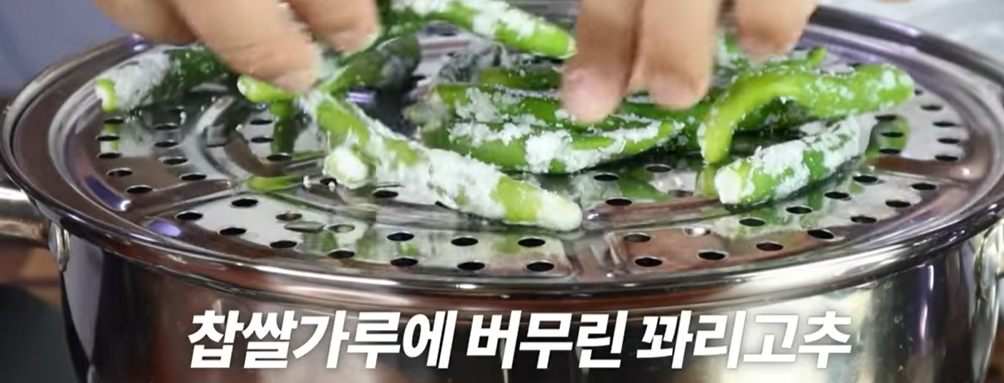 김이 올라오면 찹쌀가루에 버무린 꽈리고추를 찜기에 올립니다.