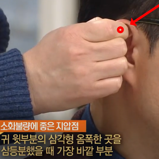 신문혈도 소화불량에 좋은 지압점으로 귀 윗부분의 삼각형 모양으로 움푹 들어간 부위를 말합니다.