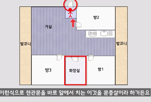 집 평면도를 살펴보자면, 현관문을 열자마자 바로 앞에 화장실이 있었는데 이런식으로 현관문을 바로 앞에서 치는 문충살의 구조는 반드시 좋지 않습니다.