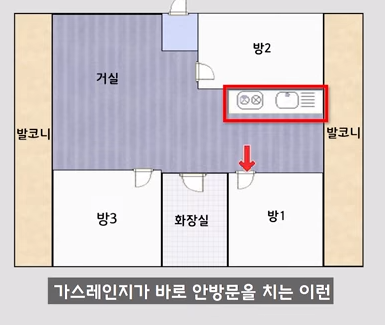 주방에서도 요리하는 가스렌지가 바로 안방문을 치는 구조도 좋지 않습니다.