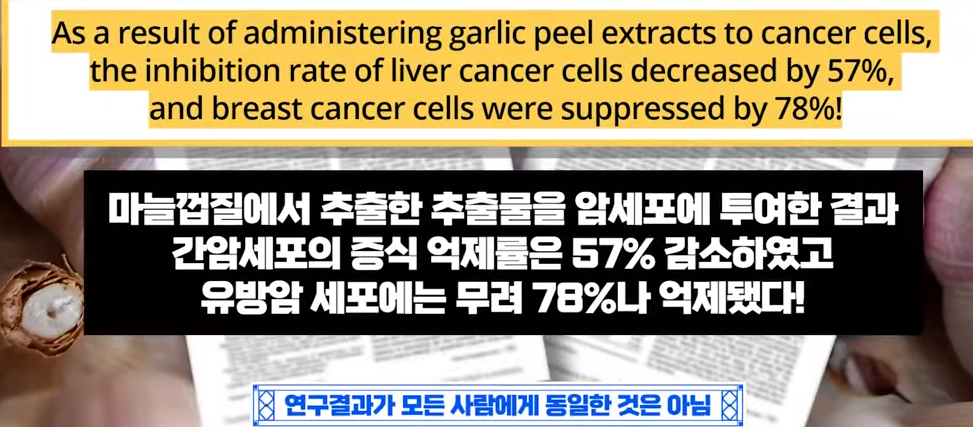 특히, 마늘 껍질은 간암, 유방암 세포의 증식을 각각 57%, 78% 억제하였습니다.