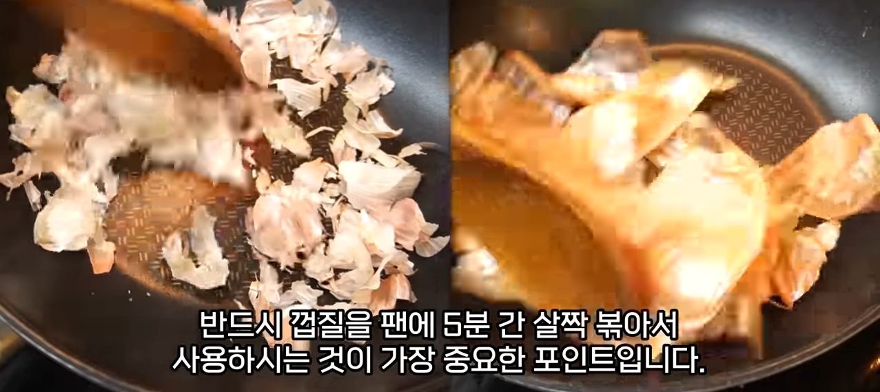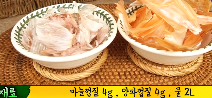 마늘과 양파의 껍질을 5분간 살짝 볶은 후, 물 2L에 넣고 30분간 중불로 끓이면 완성됩니다.