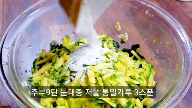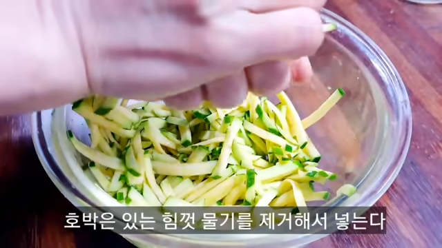 애호박은 채썰어서 소금을 뿌려 절여줍니다.