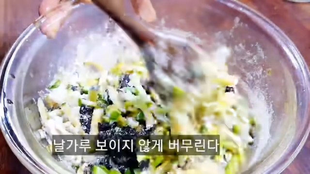 재료- 묵은김 20장, 뜨거운 물 1리터, 애호박 1개, 쪽파 1뿌리, 통밀가루 3스푼, 계란 두개, 식용유 4스푼, 소금 반티스푼, 후추 반티스푼