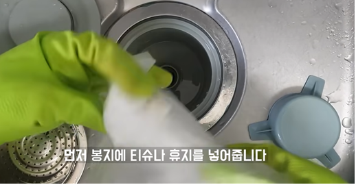 제일 먼저 비닐봉지에 티슈를 넣어 구멍을 막아줍니다. 구멍의 크기보다 크게 해서 물에 쓸려 내려가지 않도록 구멍을 막아줍니다.