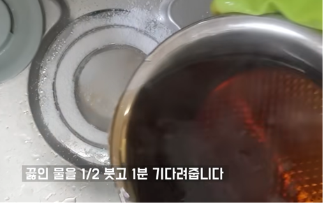 과탄산소다 위에 끓인 물을 1/2 붓고 1분간 기다려줍니다.