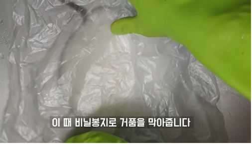 거품이 넘쳐나기 시작하면 비닐봉지로 거품을 막아줍니다. 시원하게 거품세제로 싱크대배수구가 청소되고 있습니다.