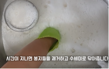 시간이 지나면 구멍을 막아놓았던 봉지들을 제거하고 수세미로 간단하게 닦아줍니다.