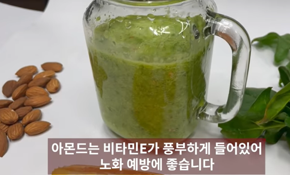 시금치 한 뿌리, 오렌지 1개 (또는 귤 1개), 아몬드 10~15개, 물 한 컵